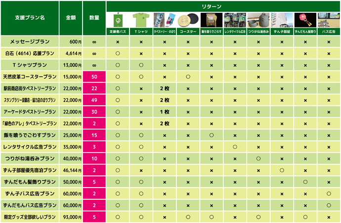 リターンの種類がたくさんありますので、一覧表で支援プランをご検討ください!