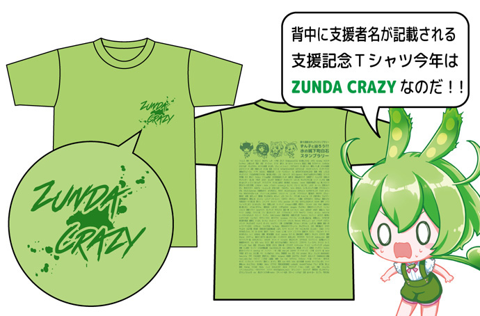 今回のTシャツの左胸マークは東北ずん子スタンプラリーの創作の力によって生み出された「ZUNDA CRAZY」です。