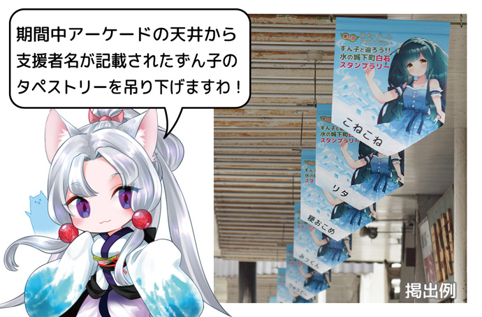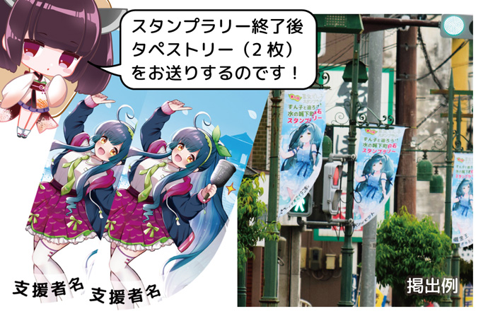 スタンプラリー開催期間中、駅前商店街に掲げるタペストリーに名前(会社名)を掲載し、スタンプラリー終了後、掲げたタペストリー1枚と同じ絵柄の新品タペストリー1枚、合計2枚をお送りいたします。