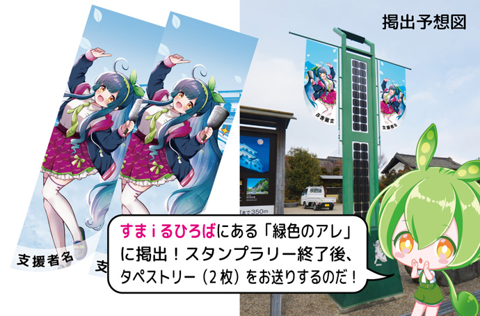 スタンプラリー開催期間中、すまiるひろばにある「緑色のアレ」に掲げるタペストリーに名前(会社名)を掲載し、スタンプラリー終了後、掲げたタペストリー1枚と同じ絵柄の新品タペストリー1枚、合計2枚をお送りいたします。