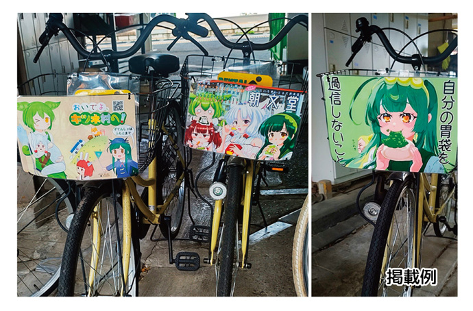 レンタサイクルのカゴの部分に支援者が作成した東北三姉妹のイラスト、写真等を1年間掲載できます。事務局で準備した枠に会社名やお名前を入れることもできます。