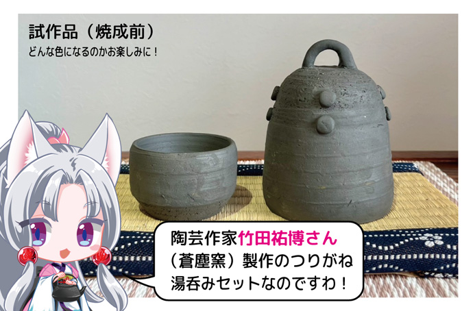 白石市在住の陶芸作家竹田祐博さん(蒼塵窯)製作のつりがね湯呑みセット(つりがね湯呑み、湯呑み置きとしても使用可能なぐい呑みのセット)をお送りいたします。
