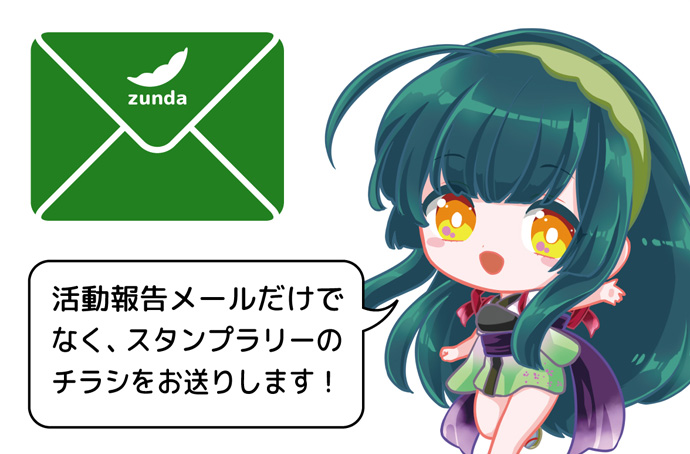 お礼のメッセージ、ずん子スタンプラリーの最新情報をメールで送信いたします。
