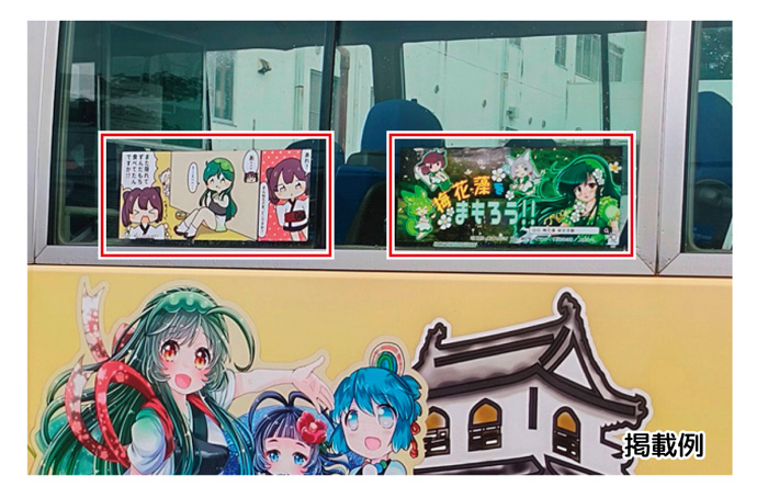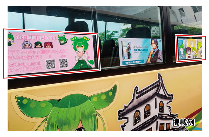 ずん子バスまたはずんだもんバス(白石市民バス「きゃっするくん」)の助手席側窓500×200mmのスペースに支援者が作成した東北三姉妹・ずんだもんのイラスト等を1年間掲載できます。