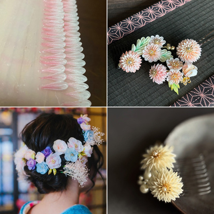 正絹を丁寧に手染めし、四季折々の花鳥風月をつまみ細工で表現しています。今回は公式イラストのずんだもんの髪飾りをつまみ細工の伝統的な技術を用いて再現しました。
